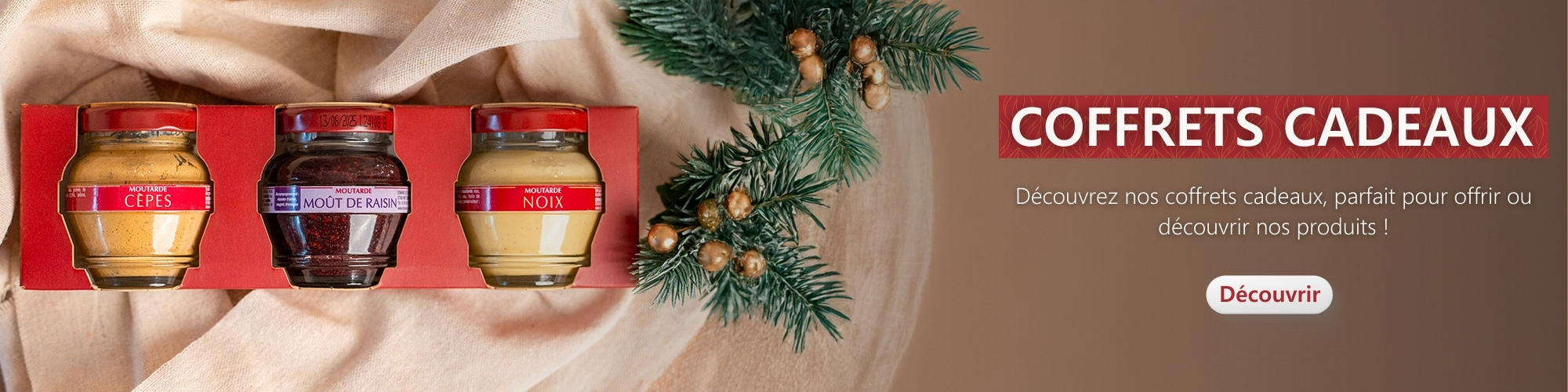 Prêts à offrir, nos coffrets cadeaux de condiments savoureux s’offrent à chaque occasion. Fêtes ou anniversaires, faites plaisir autour de vous avec nos assortiments de moutardes et condiments.