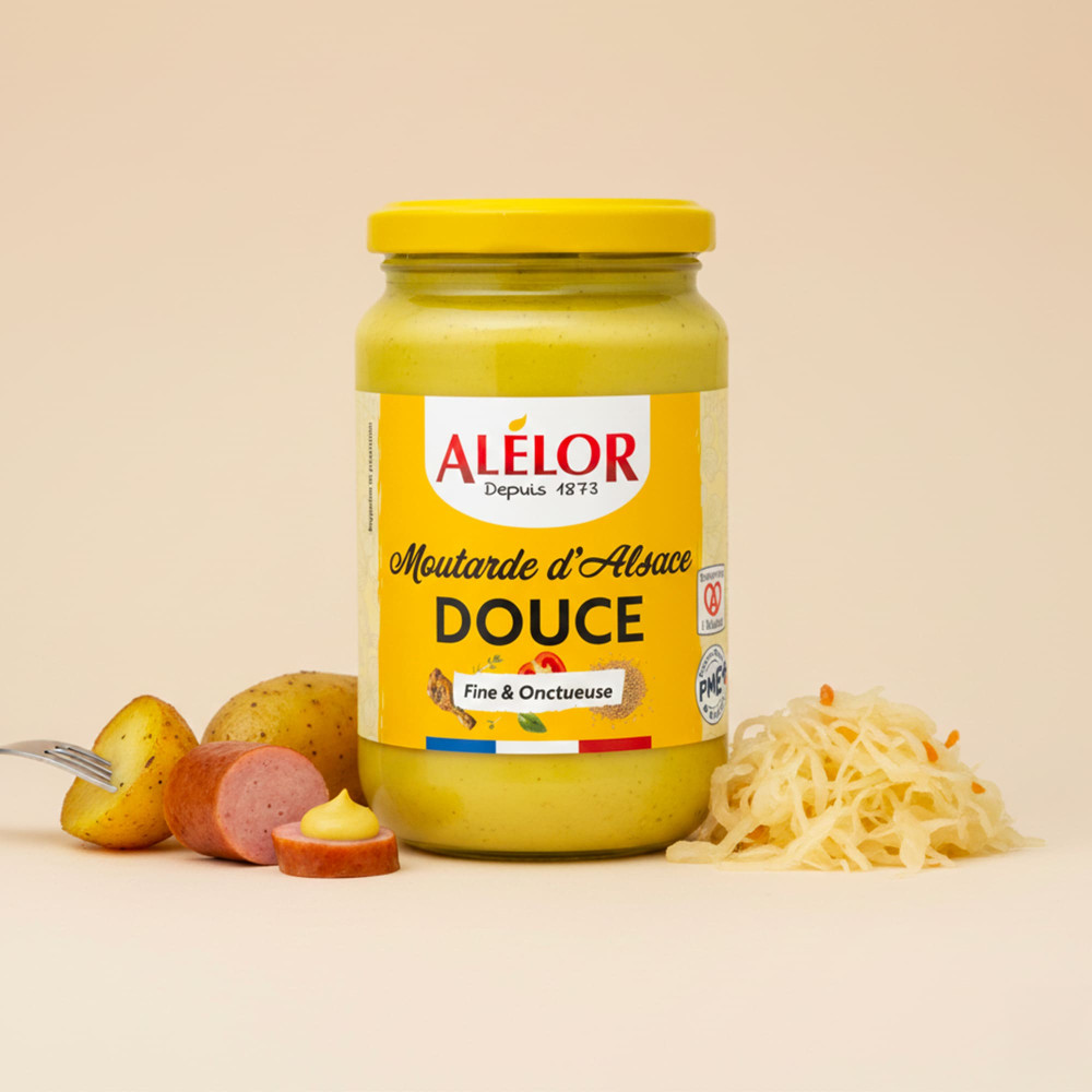 La moutarde douce d’Alsace est produite par Alélor, seule moutarderie d’Alsace. Elle s’apprécie tant pour sa douceur, que pour sa texture fine et onctueuse. La moutarde douce d'Alsace est le produit phare fabriqué par Alélor depuis 1873. C'est la moutarde traditionnelle des Alsaciens et l’accompagnement incontournable de la choucroute d’Alsace. Mariez-la à vos recettes quotidiennes pour une cuisine traditionnelle ou proposez la à vos convives pour relever différents plats à base de viande ou de charcuterie. La moutarde douce, aussi appelée condiment, parfume vos viandes, poissons et légumes.Elle permet aux palais les plus sensibles de goûter enfin aux plaisirs de la moutarde sans en affronter toute la puissance.