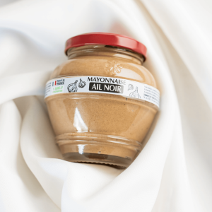 L'ail noir, obtenu par étuvage de l'ail blanc, développe des notes sucrées et caramélisées qui rappellent le vinaigre balsamique. Lorsqu'il est associé à la mayonnaise, il crée une combinaison subtile entre l'onctuosité de la sauce et l'umami de l'ail noir. Cette mayonnaise est fabriquée en Alsace, sans colorants artificiels ni conservateurs. Nous avons utilisé un maximum d'ingrédients français comme l’huile de tournesol, chère à la tradition culinaire française, du jaune d’œuf de poules élevées en plein air en France, des graines de moutarde issues de notre filière locale et de l'ail noir produit à partir d'ail blanc français.