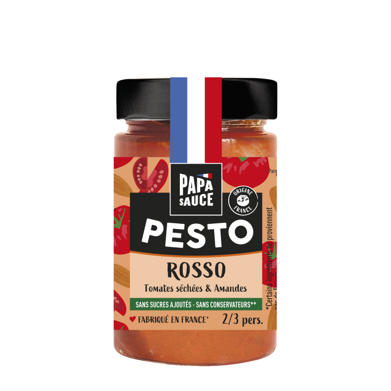 Mijoté au cœur de la Provence le pesto Rosso de notre partenaire Papa Sauce est cuisiné à partir de tomates de Provence, de Parmigiano Reggiano AOP et des amandes, rien d’autre de bizarre à l’intérieur !