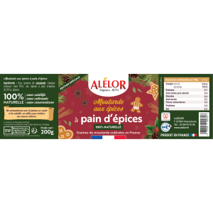 La Moutarde aux Epices à Pain d'épices est une spécialité d'Alsace pour les repas de fêtes et peut se consommer toute l'année pour les amateurs de saveurs sucrées-salées. La Moutarde aux épices à Pain d’Epices est une moutarde naturelle. Sa recette est saine et transparente : elle ne contient aucun sulfite ni autre additif. Elle est fabriquée avec des graines de moutarde cultivées exclusivement en France en partenariat avec des agriculteurs locaux.