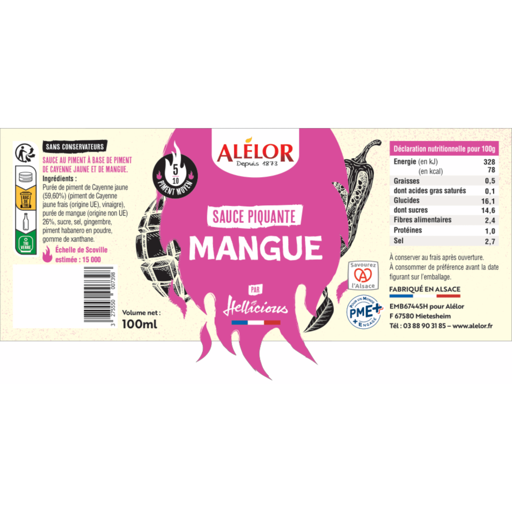 Purée de piment de Cayenne jaune (59,60%) (piment de Cayenne jaune frais (origine UE), vinaigre), purée de mangue (origine non UE) 26%, sucre, sel, gingembre, piment habanero en poudre, gomme de xanthane.