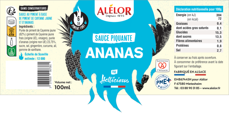 Préparez-vous à à faire le grand saut entre le savoir-faire alsacien et l'exotisme des saveurs tropicales. Alélor vous invite à un voyage culinaire à la découverte de l'équilibre parfait entre la douceur de l'ananas et la chaleur vive du Piment de Cayenne jaune. Cette sauce piquante est fabriquée en Alsace, sans colorants ni conservateurs.