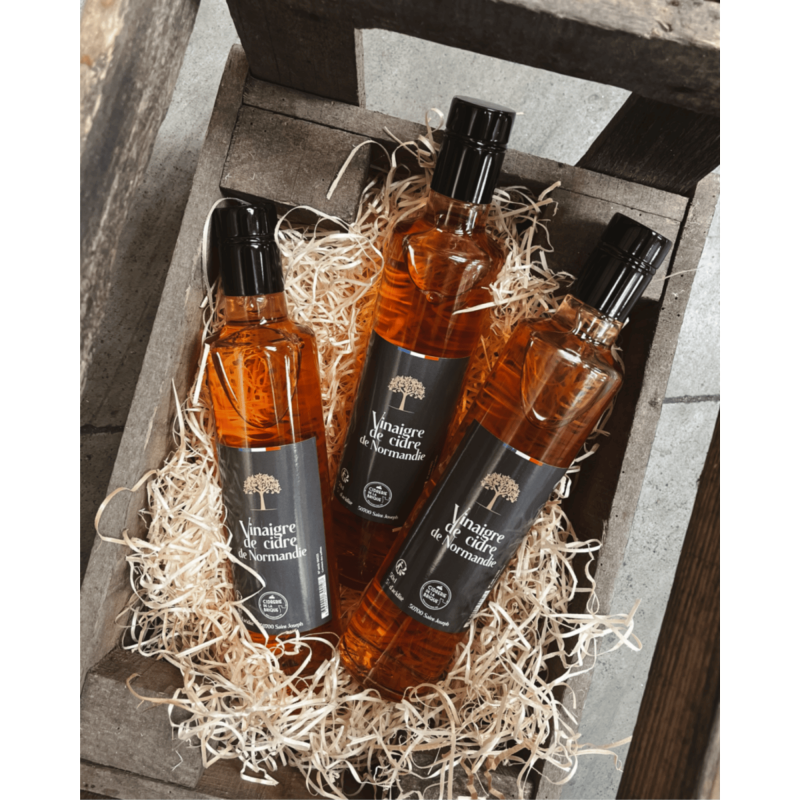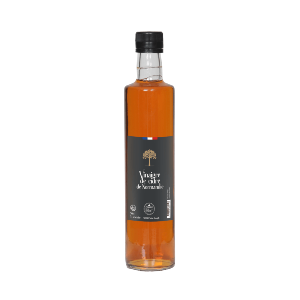 Le vinaigre de cidre est issu d’un cidre de pommes récoltées exclusivement dans le Cotentin et fermenté 100% pur jus, issu de pommes fraîches et non pasteurisé.