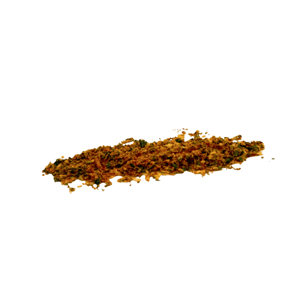 Oignon, ail, piment doux fumé, poivre noir fumé, persil, fenugrec, huile d’olive, coriandre, ciboulette, marjolaine, macis